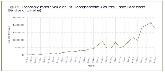The Ukrainians have been working earnestly to stand up their own component industrial base - this has been hard to do as domestic drone manufacturing went from low thousands in 2022 to the 6.5 million they expect to produce this year. The Snake Island Institute’s “Building the Arsenal” white paper is a treasure trove of information on how this has played out. As can be seen from the chart above, domestic components have not kept up with demand and they have become increasingly reliant on more and more imported Chinese parts, with domestic production finally turning a corner a few months ago (see the drop in import value curve starting to finally stabilize and taper off in the figure below).
